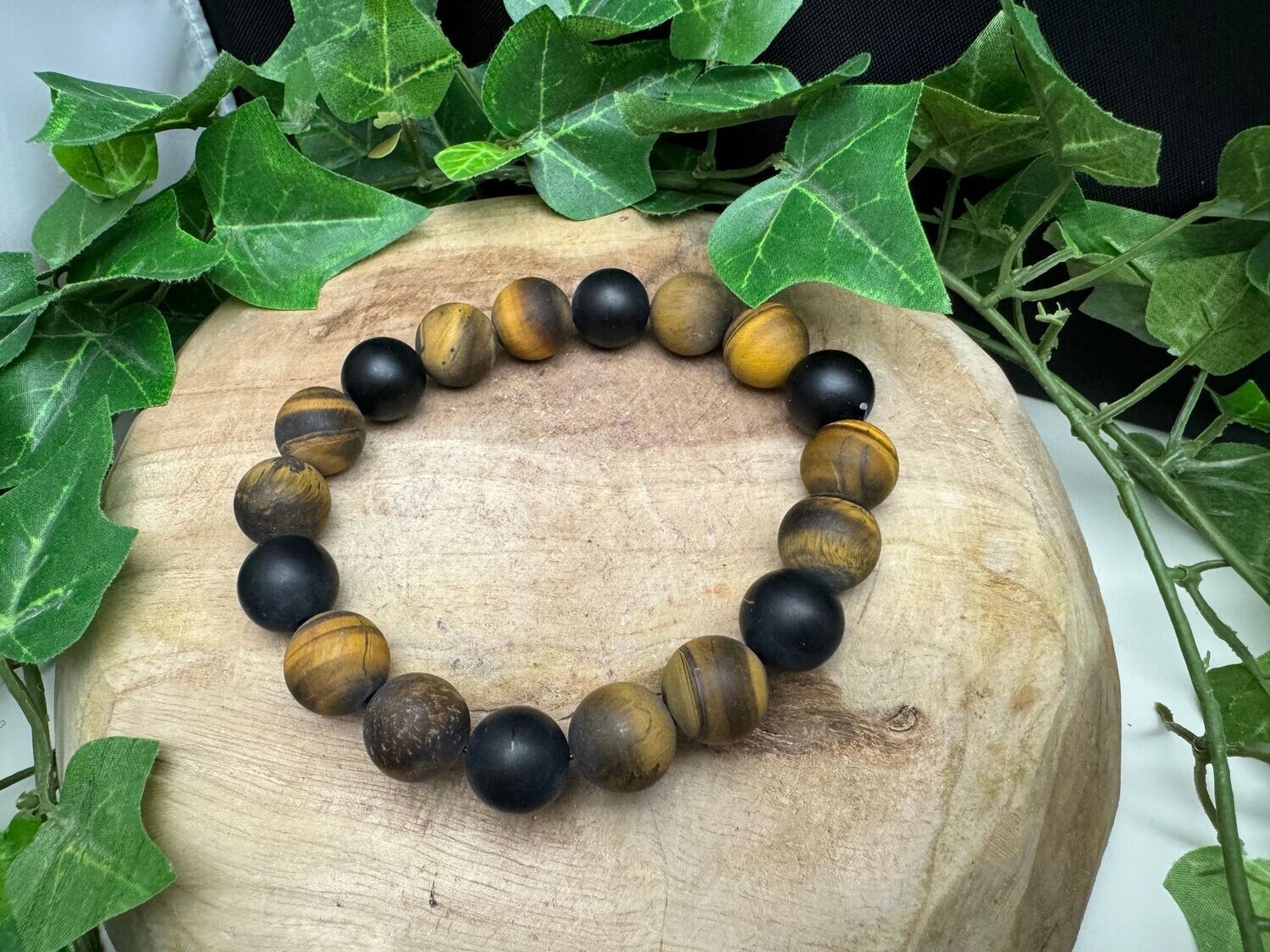Kogelarmband van 12 mm matte Tijgeroog en matte onyx ronde kralen. Deze is voor de polsmaat 19,5 - 20 cm.
