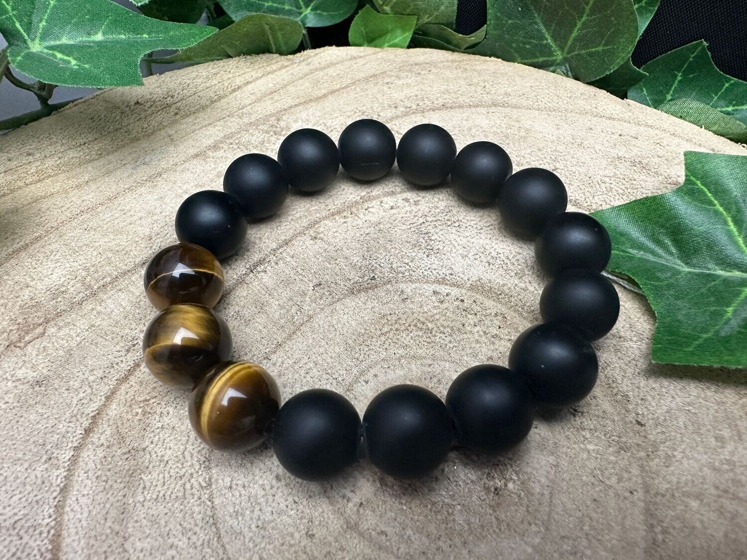Armband van matte onyx en glanzende tijgeroog. Kralen van 12mm (kies uw polsmaat)