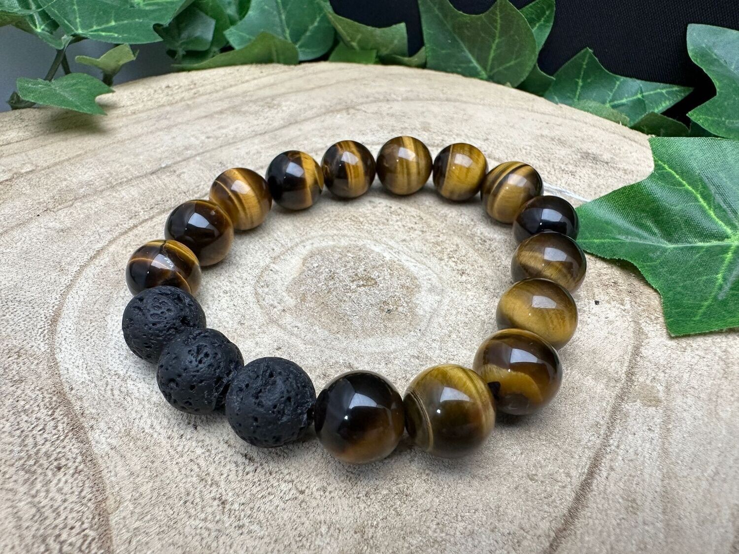 Kogelarmband van 12 mm Tijgeroog ronde kralen met 3 lava stenen. Deze is voor de polsmaat 18.5 - 19cm. Als uw maat er niet bij staat stuur ons dan een berichtje, dan maken we deze!