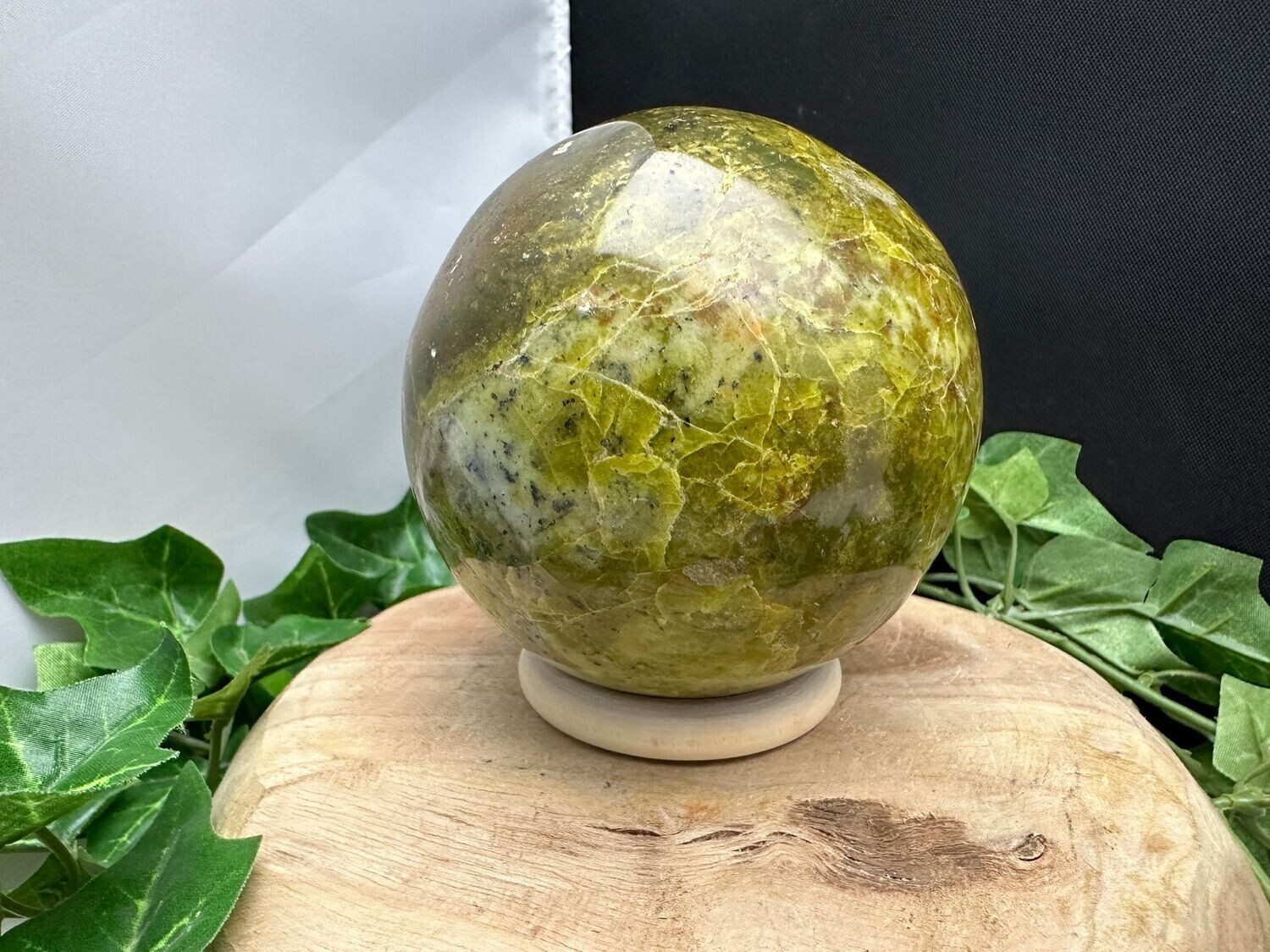 Groene opaal bol met een doorsnede van 79 mm. Hij weegt 627 gram. Houders en standaards zijn apart te bestelen.