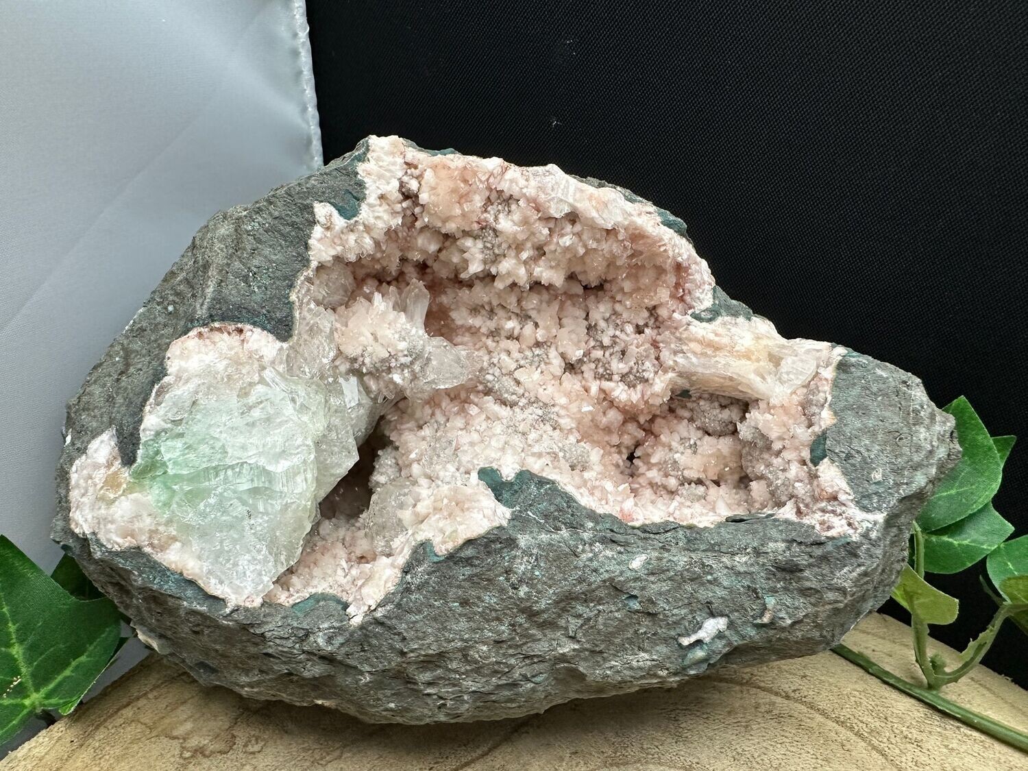 Mooie Geode van (roze) Heulandiet, met iets Stilbiet en Groene Apofyliet. Deze is ongeveer 16 cm breed en hij weegt 1.688 gram!!