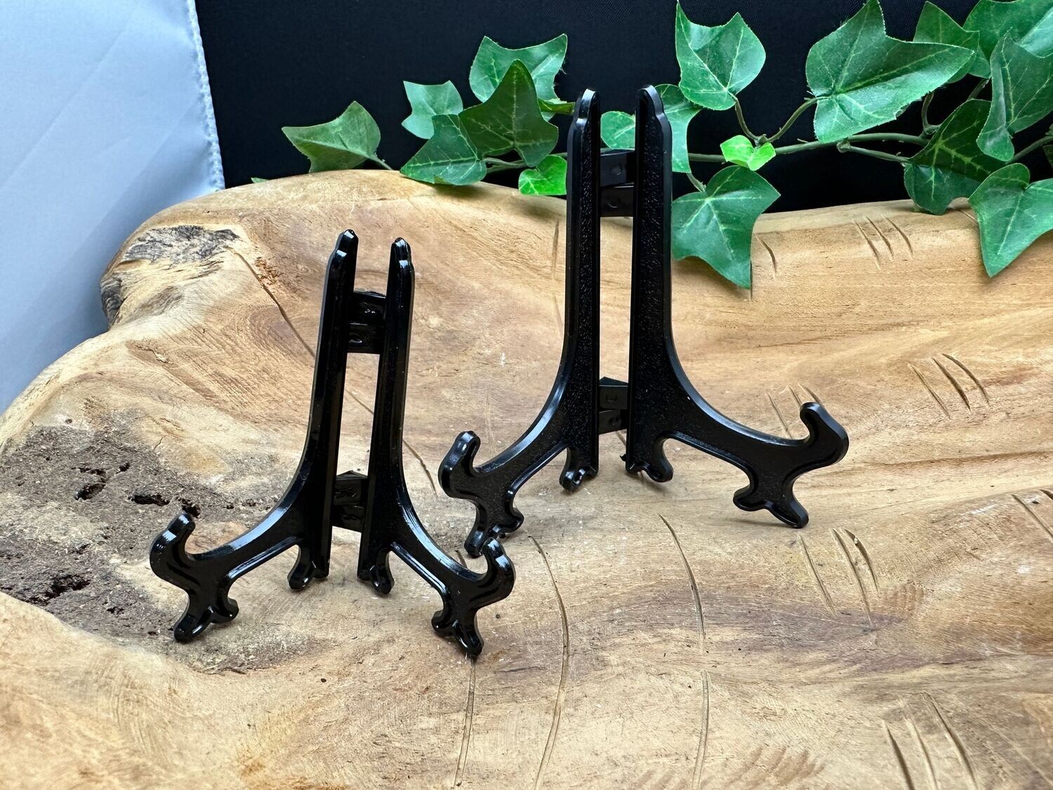 Deze zwarte standaard "A" van 7.5 cm hoog kan gebruikt worden voor b.v. agaatschijven tot ongeveer 9 cm. Op de foto een schijf versteend houd van 7 cm hoog.